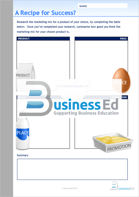 This worksheet provides a framework to research the four elements of the marketing mix for a chosen product.
