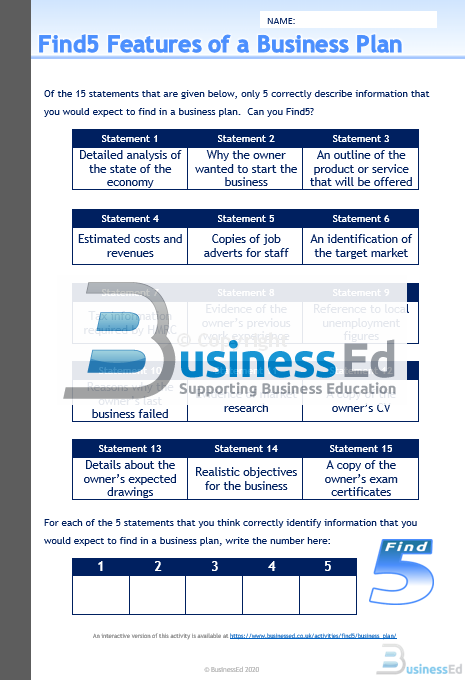 This worksheet provides 15 statements about business plans – but only 5 of them are accurate. The task is to “Find5” correct statements.