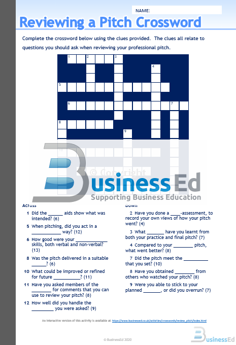 A worksheet that contains a crossword on the topic of reviewing a pitch.